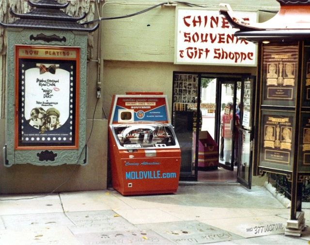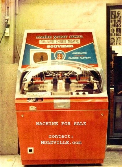 The MOLD machine stands in the same honored spot where NATALIE WOOD kneeled in 1961 to place her footprints into the cement. See it? It's also just to the side of where CARY GRANT placed his footprints 10 years before that (his are seen directly in front of the 'Now Playing' sign)