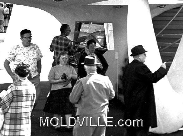 The coolest part of the closeup above is that it shows a fellow with the BUBBLE on the machine up being cleaned - he's MAINTAINING the Mold-A-Rama machine!